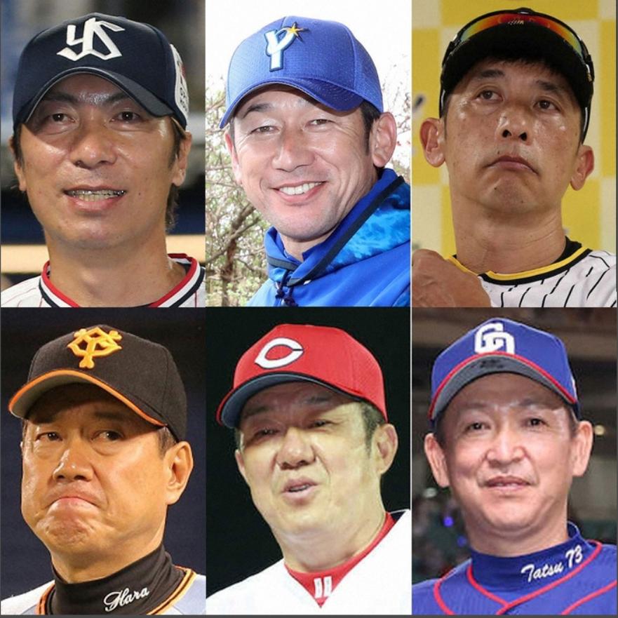 (左上から時計回りに)ヤクルト・高津監督、DeNA・三浦監督、阪神・矢野監督、中日・立浪監督、広島・佐々岡監督、巨人・原監督
