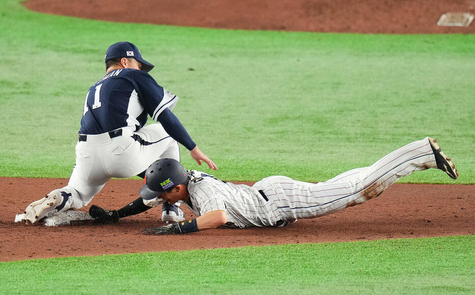 侍ジャパン中野拓夢内野手(26=阪神)、牧原大成内野手(30=ソフトバンク)、周東佑京内野手(27=ソフトバンク)、山田哲人内野手(30=ヤクルト)が、試合前練習で遊撃のノックを受け、入念に動きを確認した。