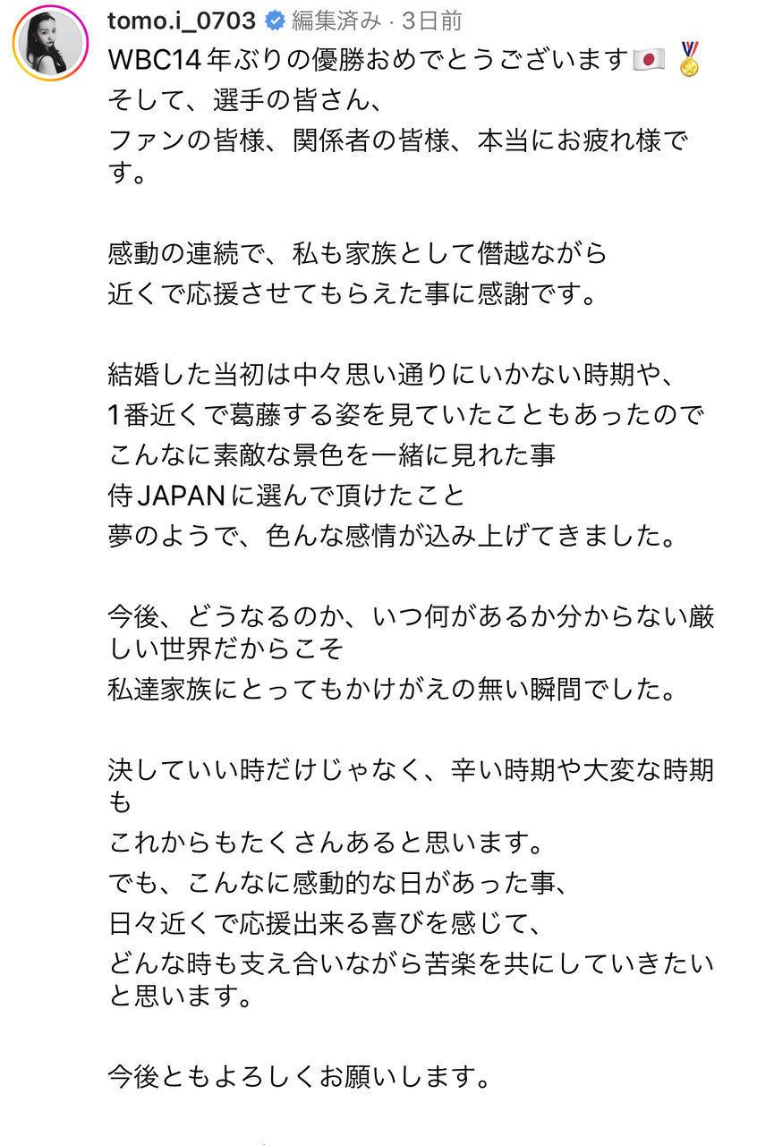 だが日本球界を代表するような選手になったのも板野さんの献身的な支えのおかげなのだろうな。