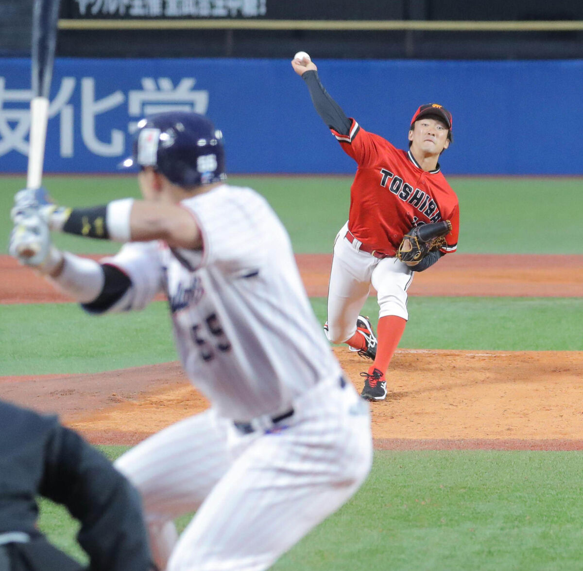 ヤクルトからドラフト1位指名を受けた東芝・吉村貢司郎投手が0―0の8回1死二塁から救援登板。弓削田を151キロ直球で空振り三振、土谷を149キロ直球で左邪飛に打ち取った。